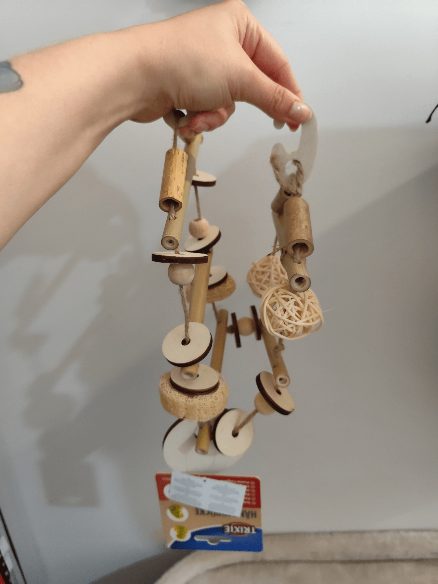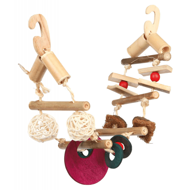 Trixie bamboo hanging bridge is made of 100% natural materials with a wooden hook. Bamboo rope, coconut, rattan, wood and sisal. For budgies and cockatiels. Trixie is a German brand specialising in pet accessories in general. Size: 45 cm.