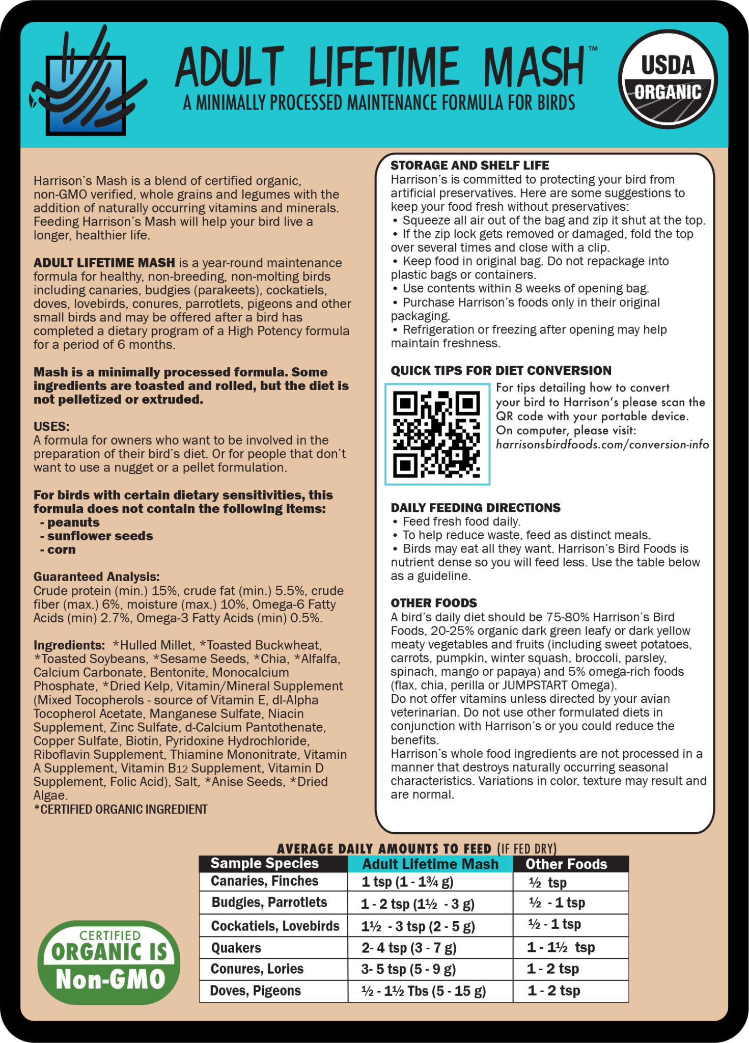 ADULT LIFETIME MASH is a year-round maintenance formula designed for healthy, non-breeding, non-molting birds, including canaries, budgies (parakeets), cockatiels, doves, lovebirds, conures, parrotlets, pigeons, and other small birds. It can be offered once a bird has completed a 6-month dietary program using a High Potency formula. For larger species, it can be mixed with water, organic fruit juice, or chopped vegetables and shaped into a dough-like consistency. If Mash is intended as a long-term nutritional aid for larger birds, we recommend using High Potency Mash.