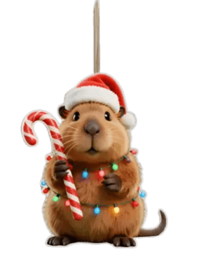 • A cuddly Capybara holding a candy cane wrapped in fairy lights