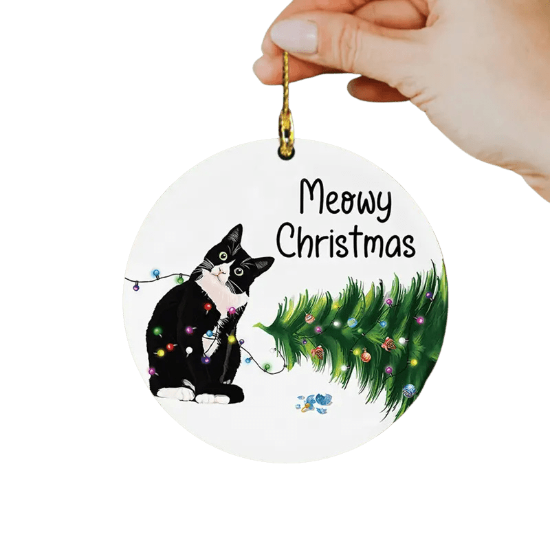• A mischievous black-and-white cat tangled in Christmas lights with a “Meowy Christmas” greeting
