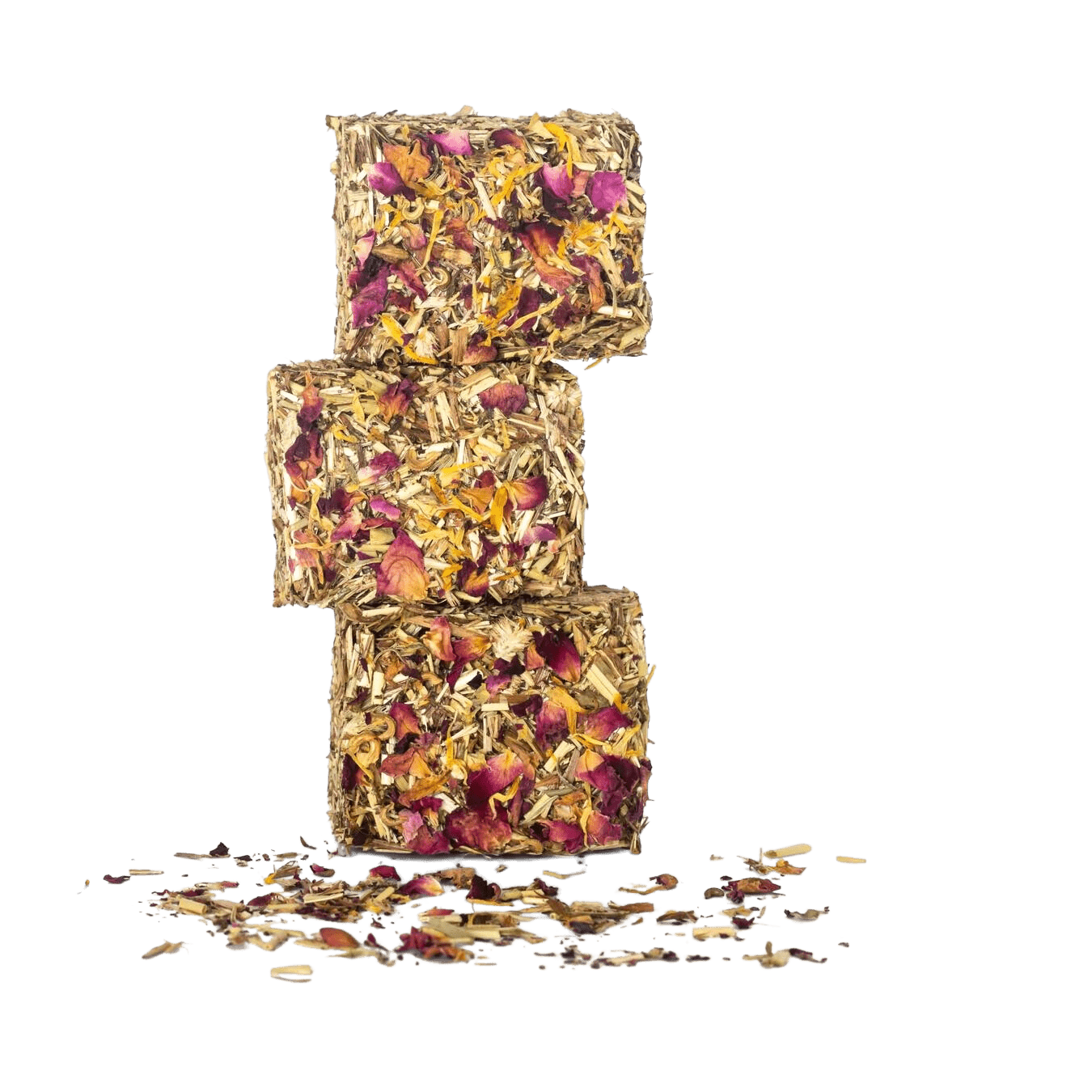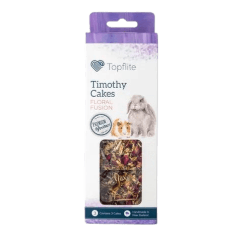 Delicious, natural fibre-rich treats! The main ingredient, Timothy hay, is a sweet smelling and nutritious grass that has many health benefits for your furry friends! Each box contains three cakes.