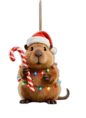 A cuddly Capybara holding a candy cane wrapped in fairy lights