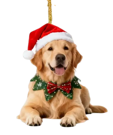 A joyful Golden Retriever wearing a Santa hat and festive bow tie