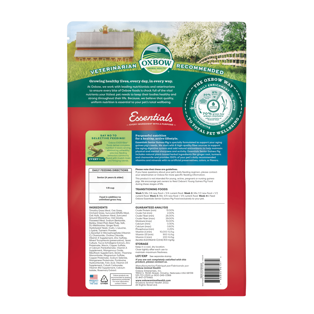 Optimal daily nutrition comes from balanced meals chock full of essential vitamins and minerals in every bite that will keep your pet’s body healthy and strong. All Oxbow foods are made with purposeful, premium ingredients and are 100% uniform to prevent the unhealthy selective eating habits that come with muesli and foraging mixes, and ensure complete nutrition in every bowl, every bite, every time!