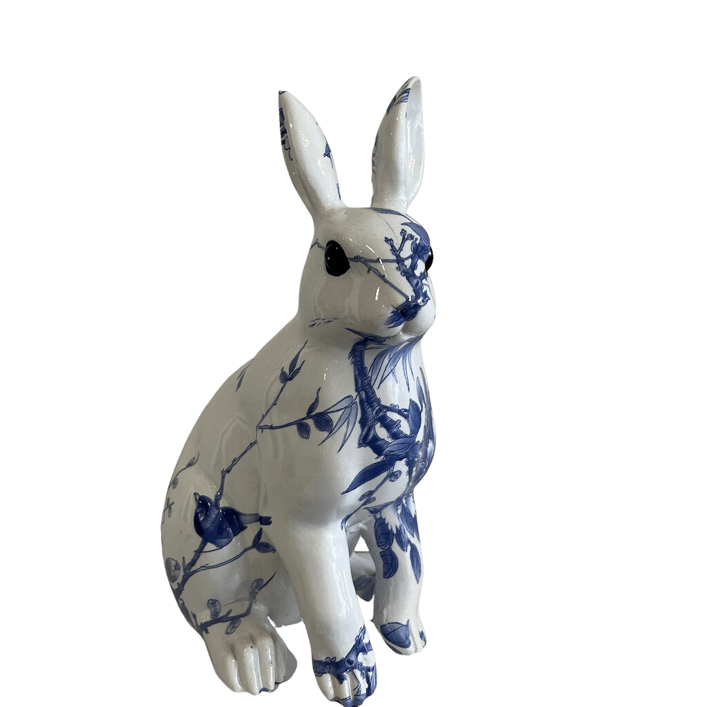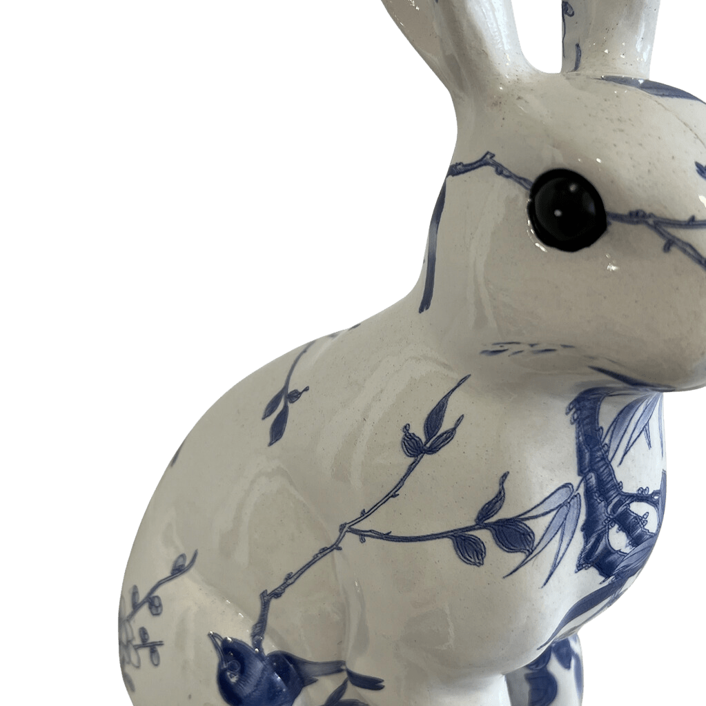 Beautifully crafted resin rabbit. White coloured with stunning shades of blue illustrating tree branches and birds. Size approx 20cm height.