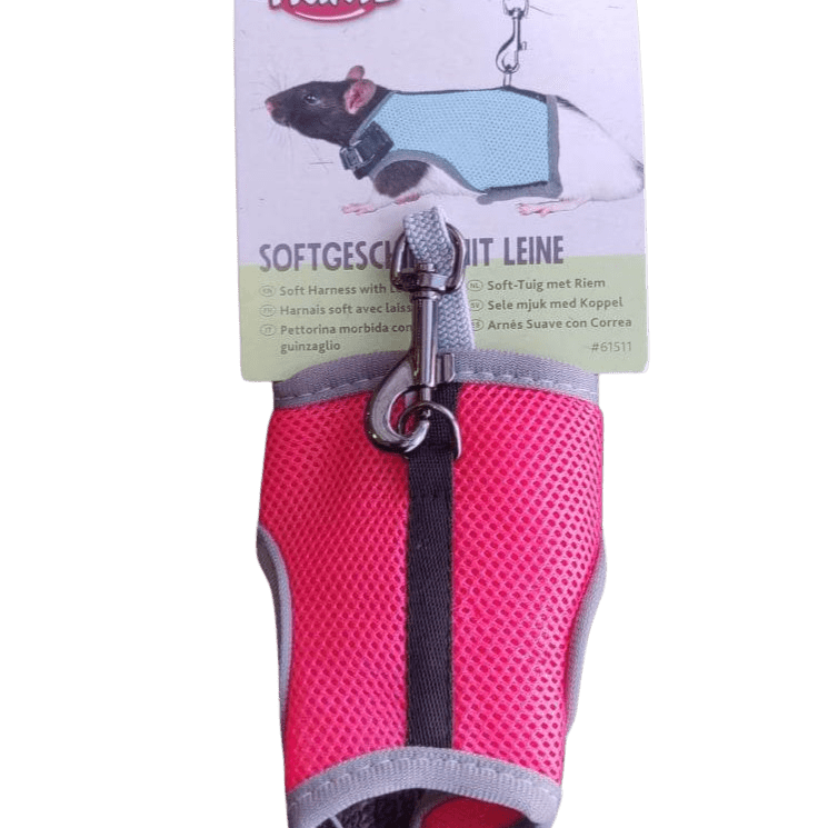 Soft Padded Harness with lead, for rats and small guinea pigs. Soft harness with fully elasticated lead, 1.2m. Good fit. Made of hard-wearing mesh material and nylon. Stomach circumference 12 - 18cm.