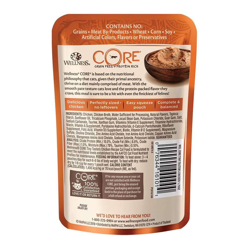 Wellness CORE is based on the nutritional philosophy that cats, given their primal ancestry, thrive on a diet mainly comprised of meat. With the smooth pate texture cats love and the protein-packed flavor they crave, CORE Tiny Tasters is sure to be a hit with even the finickiest of felines! These complete and balanced recipes are available in perfectly-sized, easy-squeeze pouches designed to eliminate leftovers.